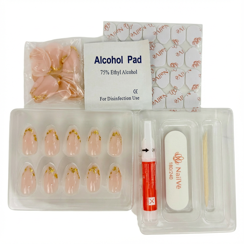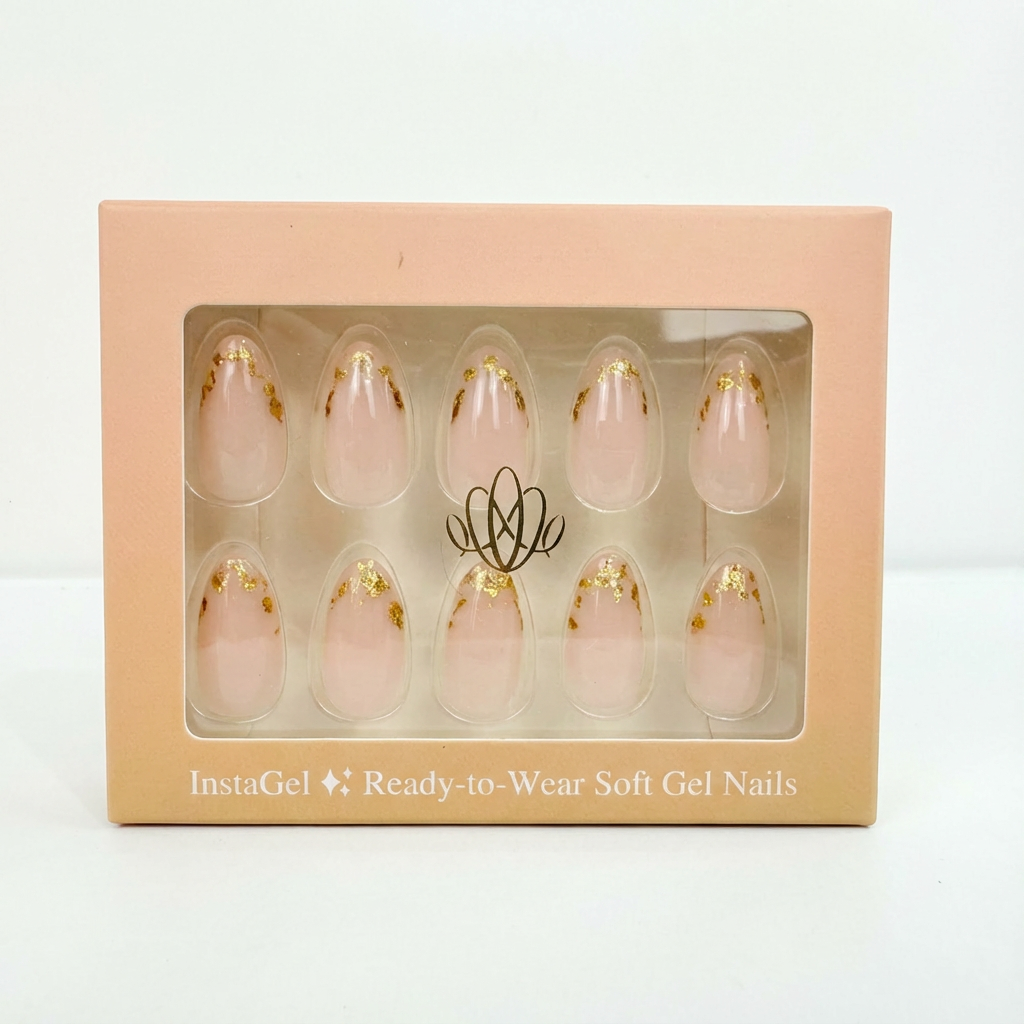 Gold Dust — Nude Pink with Gold Tips InstaGel™ Soft yet luminous, Gold Dust features a nude blush base dusted with fine gold foils at the tips. A modern twist on elegance that catches light with every movement — for days when you want effortless sophistication with a hint of golden allure. What’s inside: 32 nails in 16 sizes — designed for a custom fit every time Complete prep kit — nail file, alcohol prep pad, wooden cuticle pusher, nail glue, gel nail stickers (for non-damaging wear) Style vibe: 🌸 Delicate | 💫 Radiant | ✨ Effortlessly refined