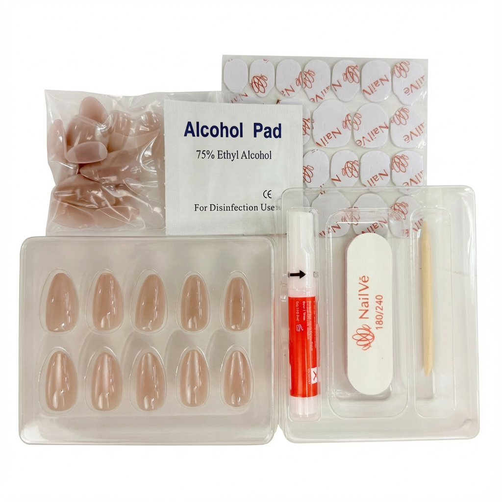 Complete prep kit — nail file, alcohol prep pad, wooden cuticle pusher, nail glue, gel nail stickers (for non-damaging wear)