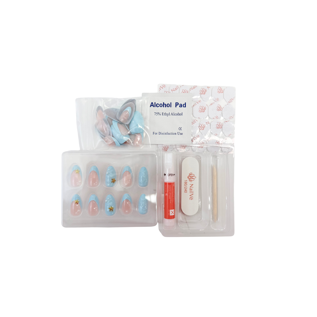 • Complete prep kit — nail file, alcohol prep pad, wooden cuticle pusher, nail glue, and gel nail stickers for non-damaging wear