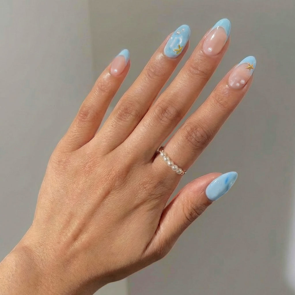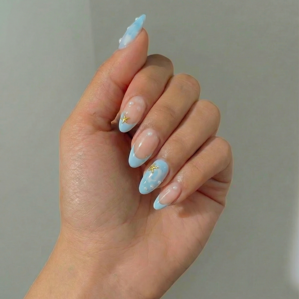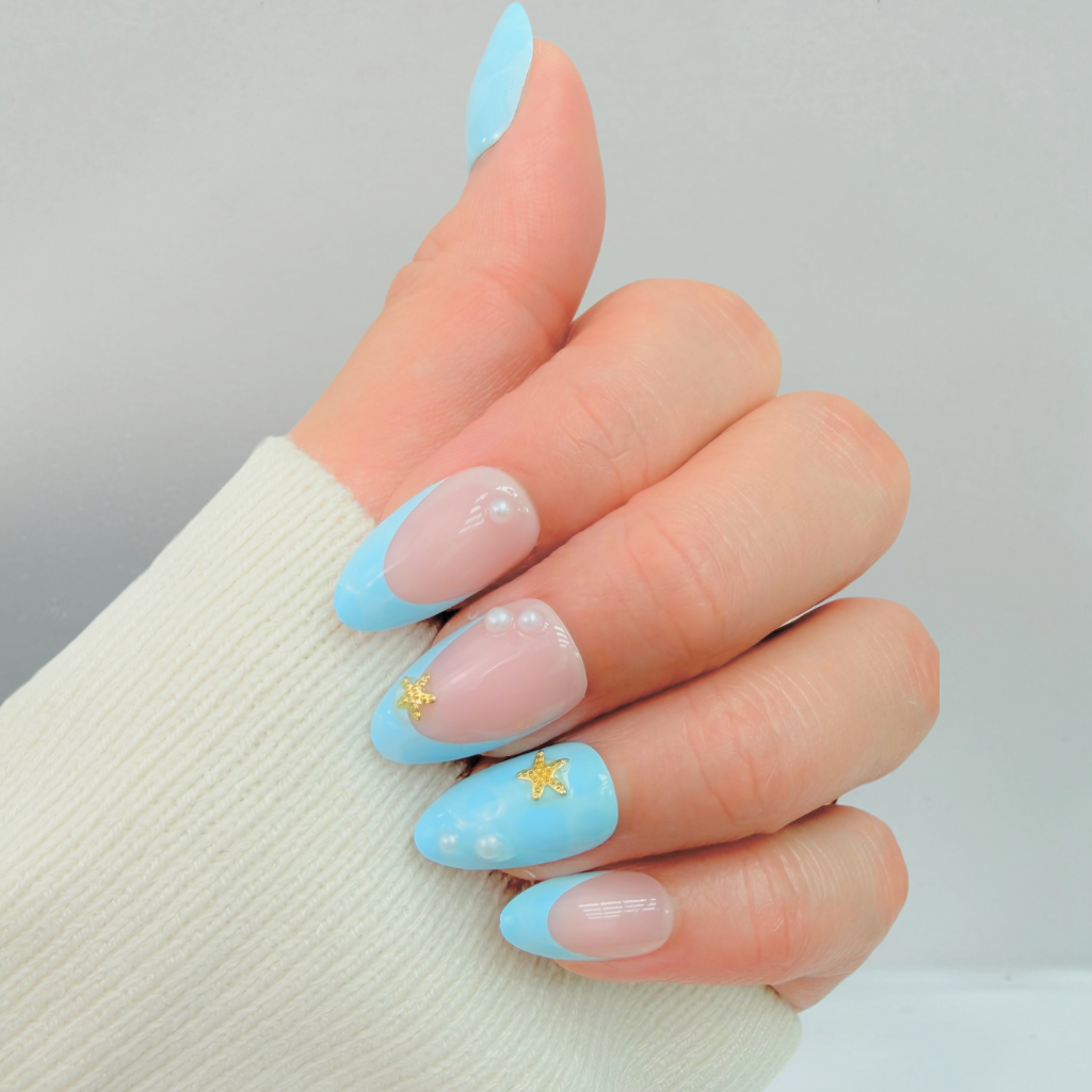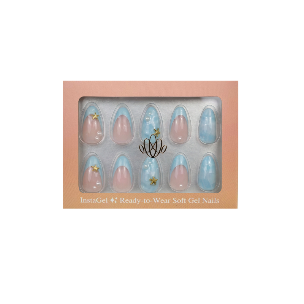 Dreamy and luminous, Mermaid Pearl features soft ocean-blue French tips accented with delicate pearl details and subtle gold touches. Inspired by sunlit waves and coastal elegance, this design delivers a fresh, elevated manicure that feels airy, ethereal, and effortlessly luxurious