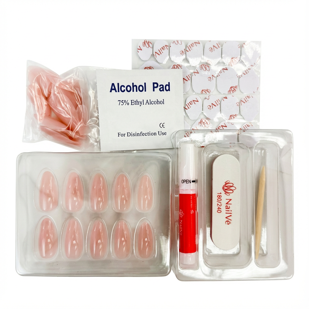 Complete prep kit — nail file, alcohol prep pad, wooden cuticle pusher, nail glue, gel nail stickers (for non-damaging wear)