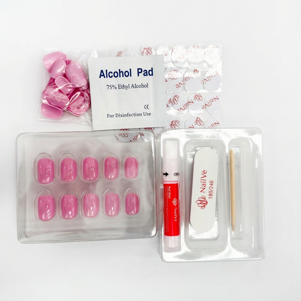 Complete prep kit — nail file, alcohol prep pad, wooden cuticle pusher, nail glue, gel nail stickers (for non-damaging wear)