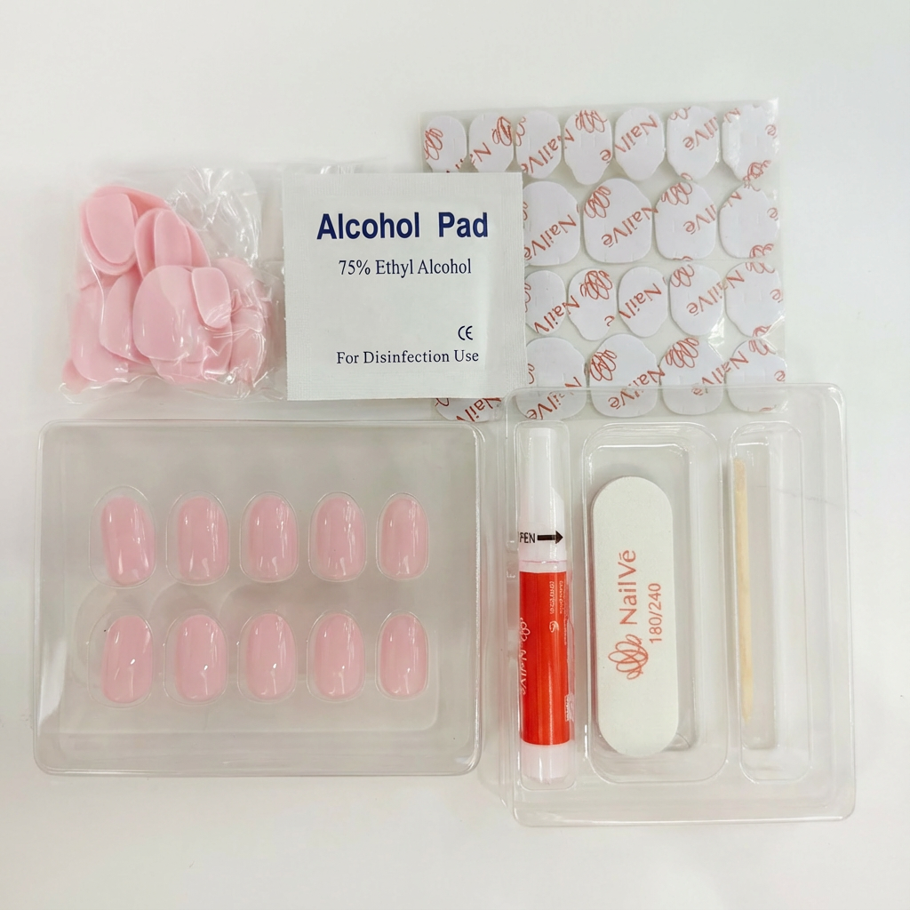 Complete prep kit — nail file, alcohol prep pad, wooden cuticle pusher, nail glue, gel nail stickers (for non-damaging wear)